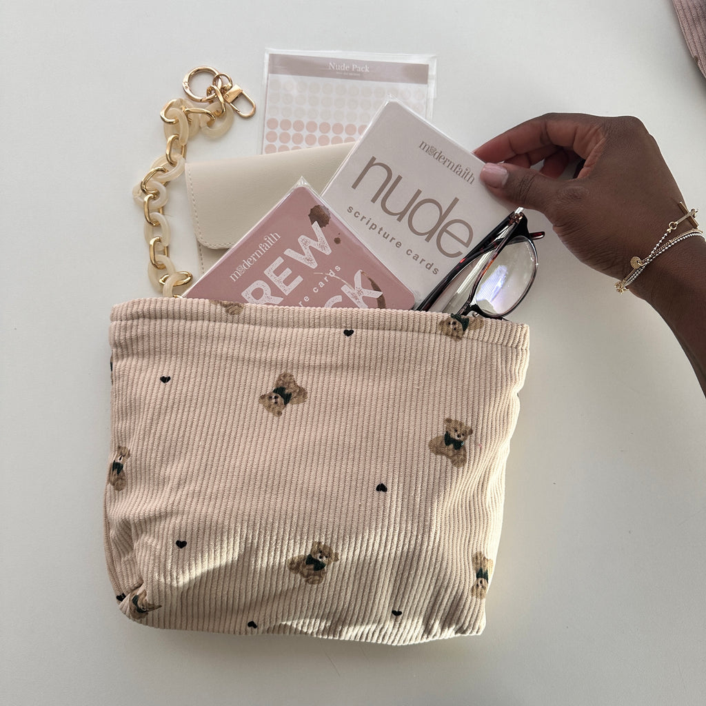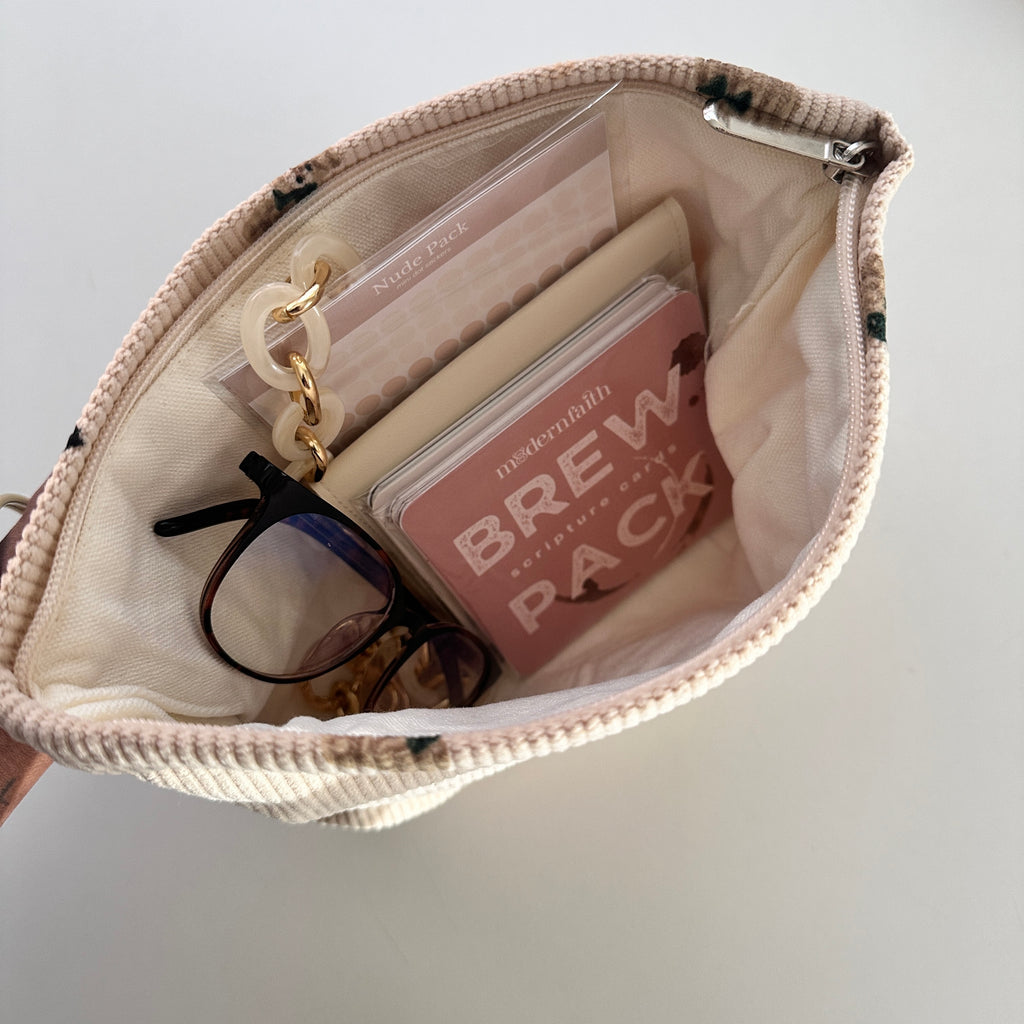 Add all of your Modern Faith tackers, pens and stationary to these corduroy pouch. This soft pouch can be used for any of your stationary or personal needs.