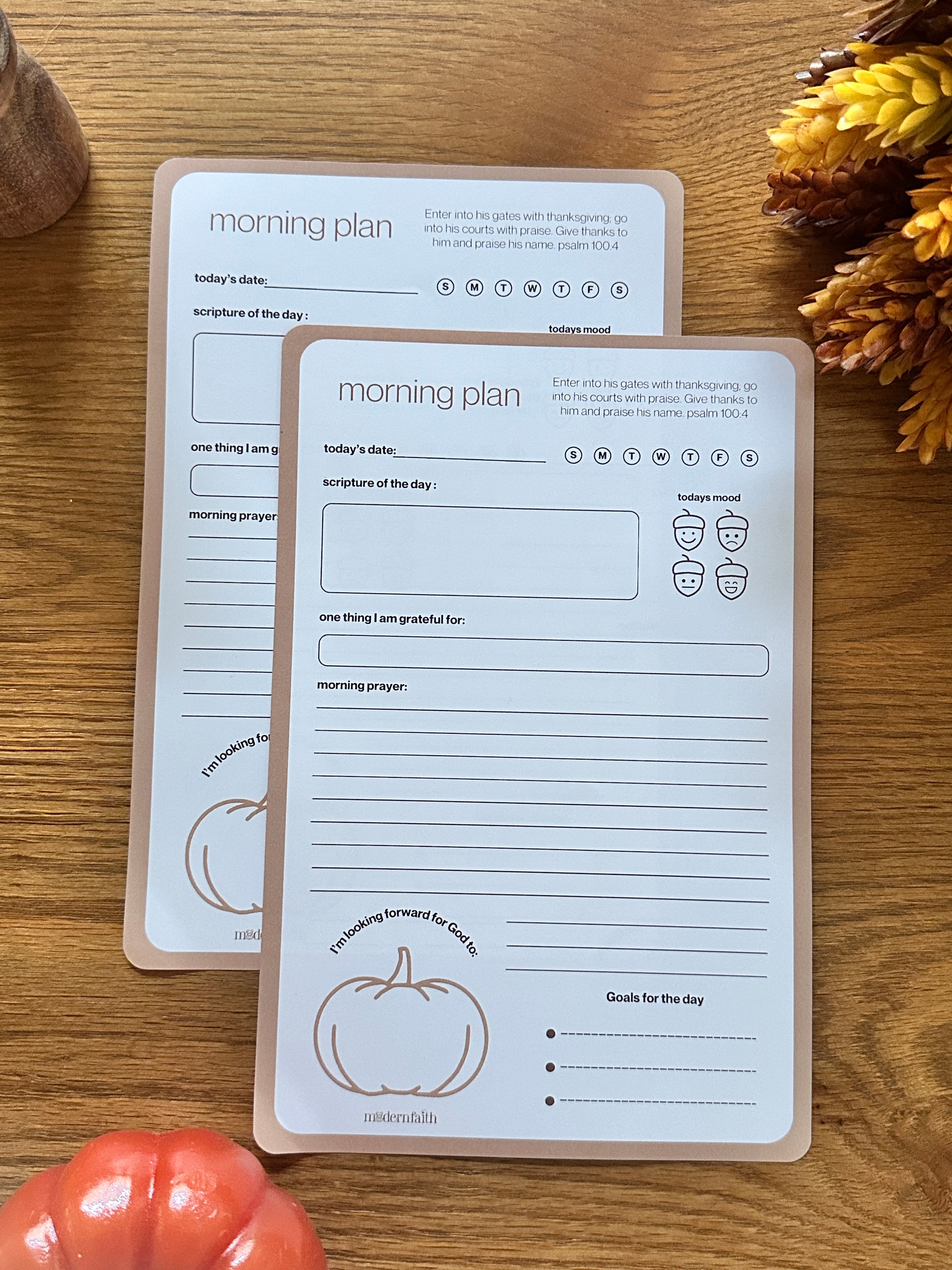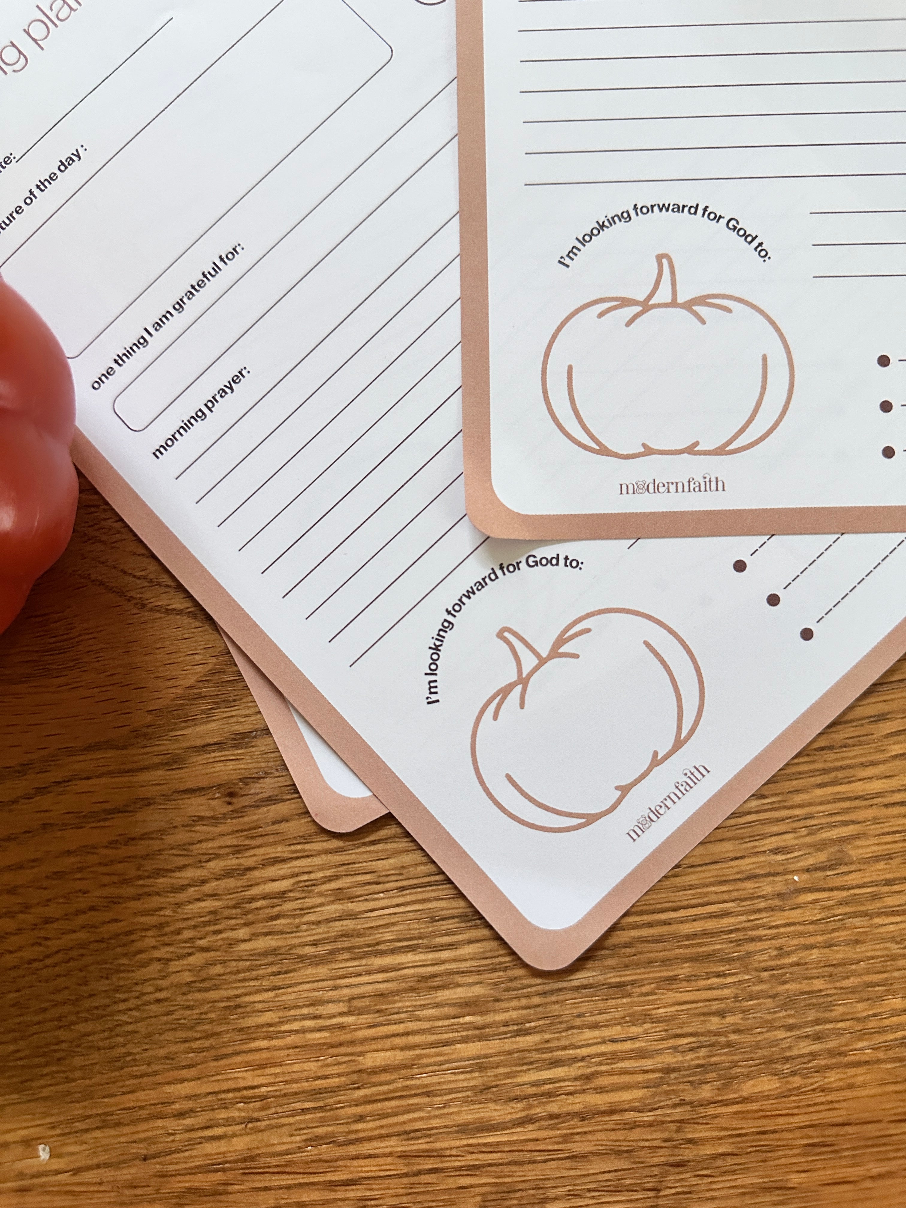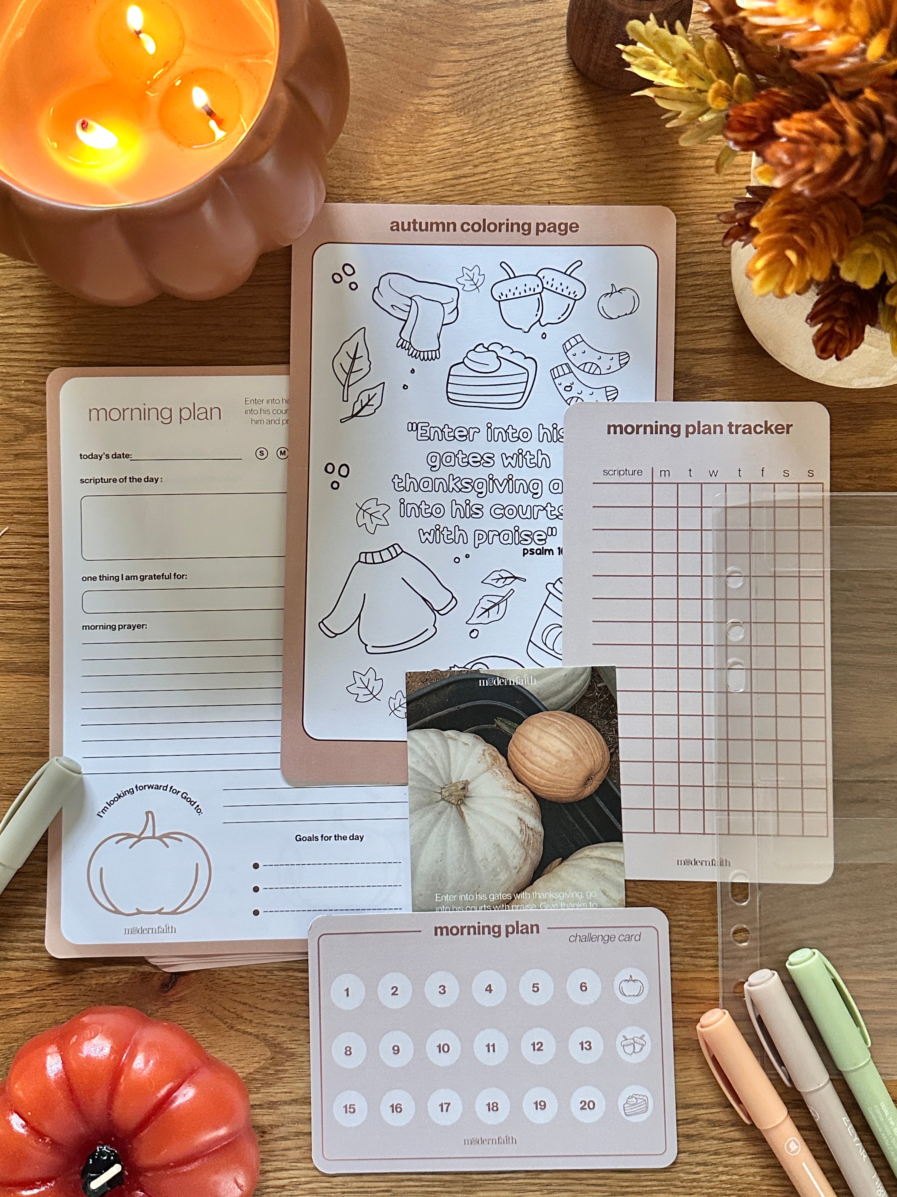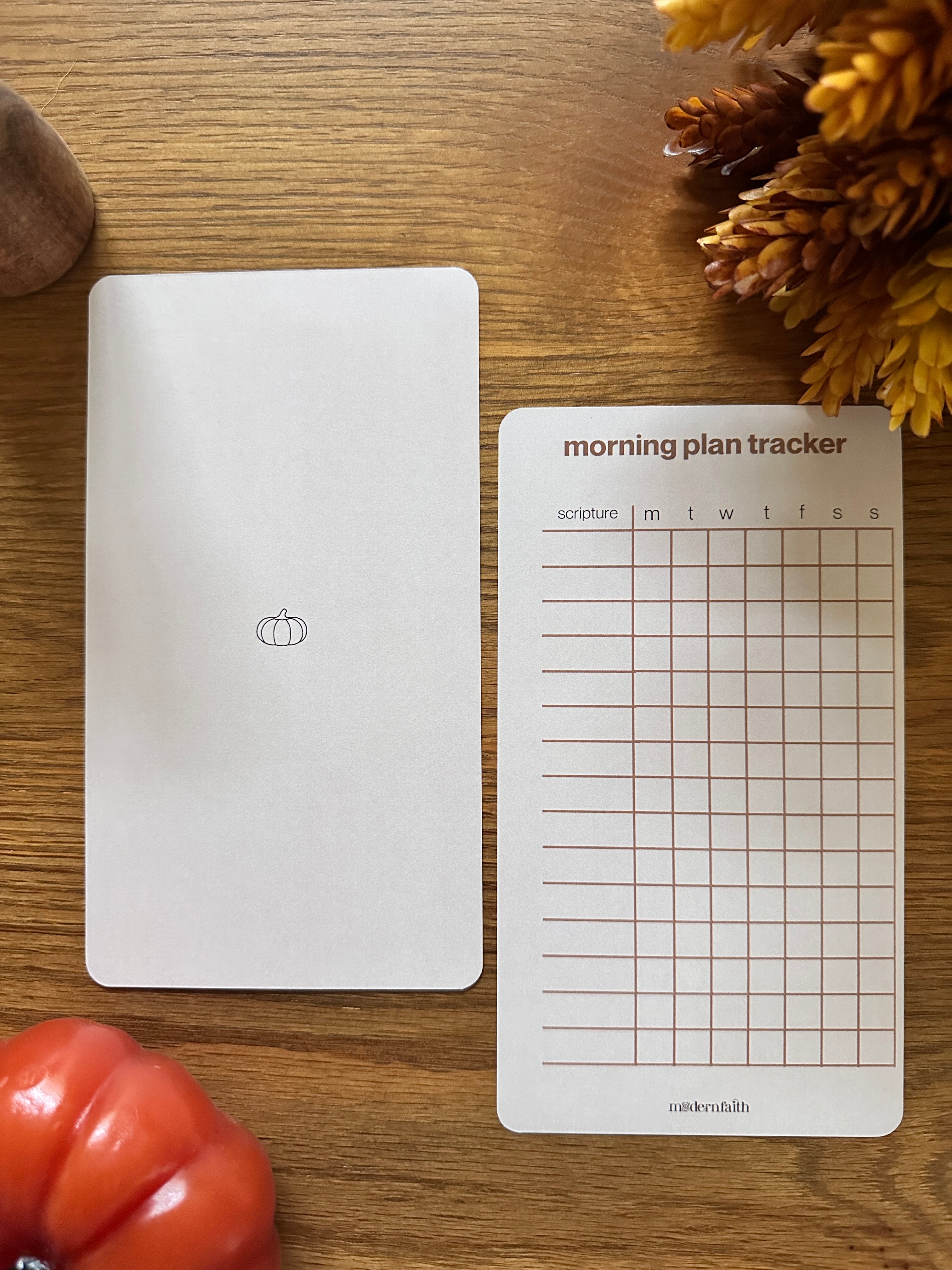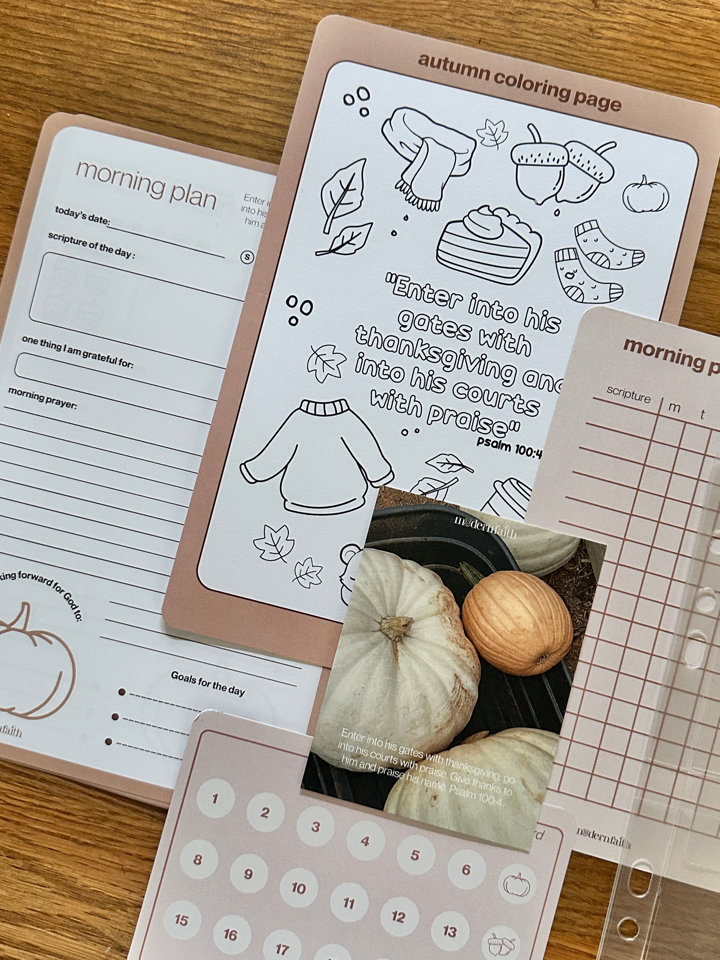 This kit is a limited edition kit for the Autumn season. Savor this season by adding the pumpkin Morning Pages to your quiet time routine, spread God's love with the greeting card, and stay consistent with two types of trackers. This kit is the perfect combination to warm your spirit as you sip your favorite autumn coffee or tea!